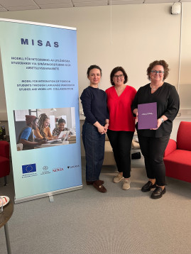 Fr.v. Olga Orrit från Vård- och omsorgscollege i Sverige, språkombudsutbildare Åsa Lågland och Terese Herrgård-Backlund vid Yrkeshögskolan Novia. Foto: Linda Granback