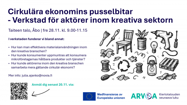 Jobbar du inom den kreativa branschen i Åboregionen och skulle vilja befrämja cirkulär ekonomi och mer hållbar framtid? Du är varmt välkommen till ARVOA-projektets verkstad där du tillsammans med andra aktörer från den kreativa branschen får hitta på framtidens cirkulära lösningar.